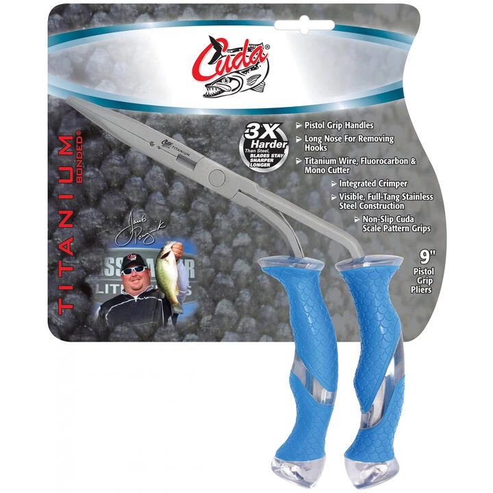 The Cuda® 9” Titanium Bonded Stainless Steel Freshwater Pistol Grip Pliers feature an integrated crimper and long nose for removing hooks.