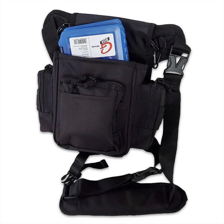The bag is designed for over-the-shoulder carrying. Just swing bag to your chest for access, swing around to your back when walking, casting, battling fish and taking selfies. It’s so comfortable, it never needs to be taken off.
