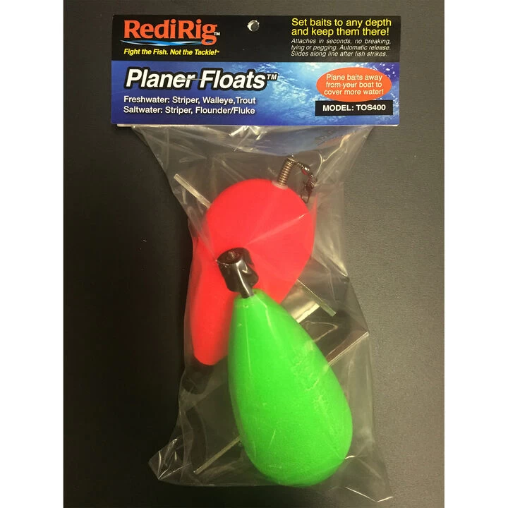 Built to plane at an angle of 25 -35 degrees, you now can cover even more water and get your presentation away from the boat. Utilizing RediRig’s® patented release system the TOS Planer Floatsâ„¢ are easy to use. Use live bait like bunkers and eels or cut bait with up to 2 oz. of weight.