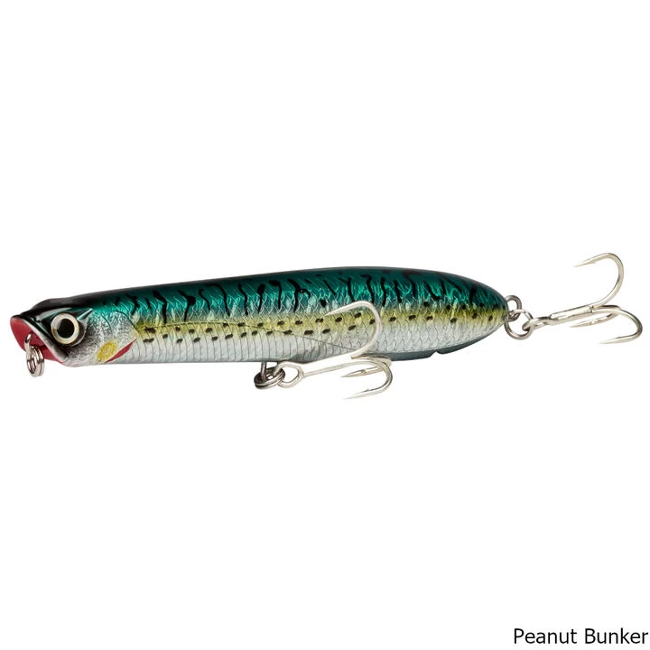 The lure moves with an enticingly erratic action that pulls fish to the surface and provokes them to strike. Its stepped-hull design draws air in along the plug’s sides to its underside, generating bubbles that signal a visual cue of feeding activity without increasing lure’s drag and causing angler fatigue. With thru-wire construction, triple split rings and 4x hooks, this plug is built to handle the most brutal saltwater gamefish species.
